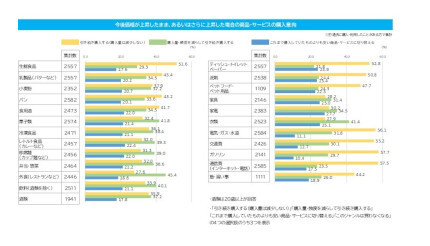一方、「購入量・頻度を減らして引き続き購入する」が多いのは「外食(レストランなど)」「衣類」が多い。また、食品では「菓子類」で「購入量・頻度を減らして引き続き購入する」が多い。