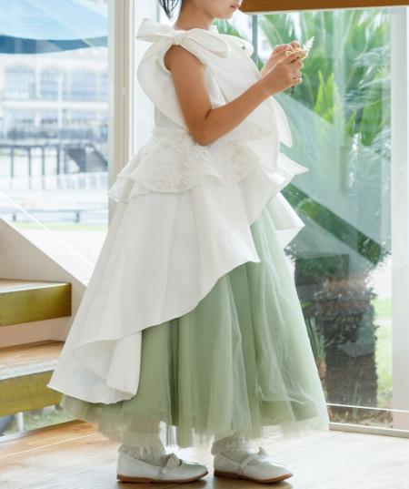 モスグリーンのチュールスカートに、オフホワイトのハリのある素材を合わせたセパレートドレス。なんと2着のウェディングドレスと1着のカラードレスを使用して作られています。