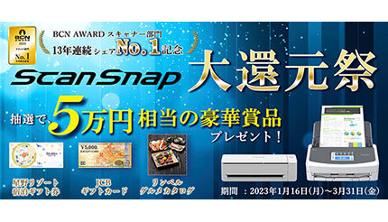 PFUは、2022年1月1日~12月31日を集計対象期間とした「BCN AWARD 2023」受賞を記念した「BCN AWARD 13年連続シェアNo.1記念 ScanSnap 大還元祭」を開催している。