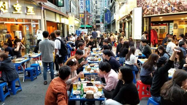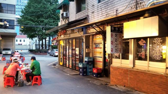 ここはソウルでもっとも盛っているビアホール街。冬場は路上に赤いテントの花が咲き、中からジョッキをぶつけ合う音が聞こえてくる。