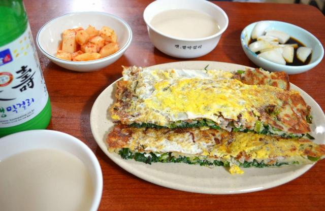 「元祖緑豆」の海鮮チヂミ。ネギたっぷりで卵でふわっとまとめられていてマッコリのつまみに最高だった