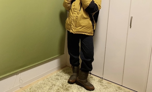 大きめのブーツなのでキャラが濃すぎて目立ってしまうのでは?と心配していましたが、黒、カーキという落ち着いたカラーを選んだおかげで、浮きすぎず全体的にまとまったコーデになりました。