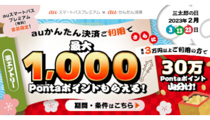 2月のキャンペーンでは、三太郎の日のauかんたん決済利用金額に応じてPontaポイントを3%(3日間の合計で最大1000Pontaポイント)還元する。さらに、これに加えて、3日間合計で3万円以上利用した人で30万Pontaポイント山分けも実施する。三太郎の日は、毎月3・13・23日に開催するおトクな3日間で、auスマートパスプレミアム会員はとくにおトクな特典が受けられる。今回のキャンペーンは、2月3日の三太郎の日から対象となる。