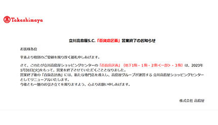 高島屋グループの東神開発が運営する「立川高島屋ショッピングセンター(立川高島屋 S.C.)」の「百貨店区画」(地下1階・1階・2階の一部・3階)は、2023年1月31日をもって営業を終了する。営業終了後の百貨店区画には、新たな専門店を導入し、高島屋グループが運営する立川高島屋ショッピングセンターとして23年秋にリニューアルする予定。