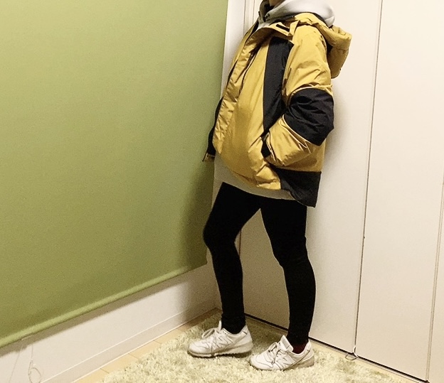 ジャケットの下からパーカーが少しはみ出し、レギンスを合わせるとワンピースのように見えてかわいいです。