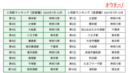 くふう住まいは1月25日に、2022年7月~12月の期間および前年同期間(2021年7月~12月)における、同社の運営する住宅・不動産専門サイト「オウチーノ」へのアクセス数のうち、首都圏(東京都、神奈川県、千葉県、埼玉県)人気駅ランキングを発表した。