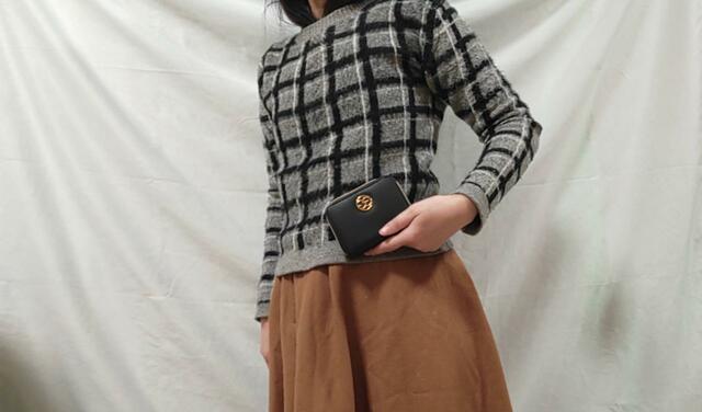 こちらのセーターはチェックの柄が大きく、合わせるアイテムが柄物だとゴチャゴチャしがちなのですが、こちらのミニ財布はシンプルなデザインなので、スッキリコーデをまとめることができました。