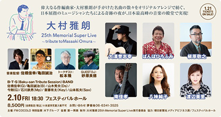 “時代の音”を創った早逝の天才音楽家、大村雅朗の没後25周年トリビュート公演が、2月10日(金)フェスティバルホールにて開催される。