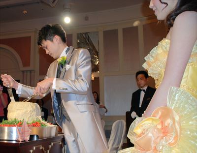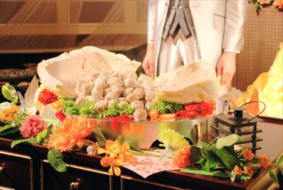 ゲストは立ち上がり、シウマイのまわりを囲み、カメラを構えて今か今かと待ち望む。