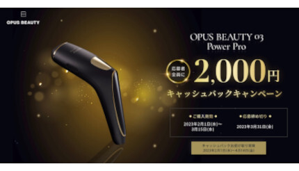 アンドワンの運営する「OPUS BEAUTY(オーパスビューティ)」ブランドは、家庭用光美容器「OPUS BEAUTY 03 Power Pro」購入者を対象とした初のキャッシュバックキャンペーンを、2月1日~3月15日の期間に開催する。