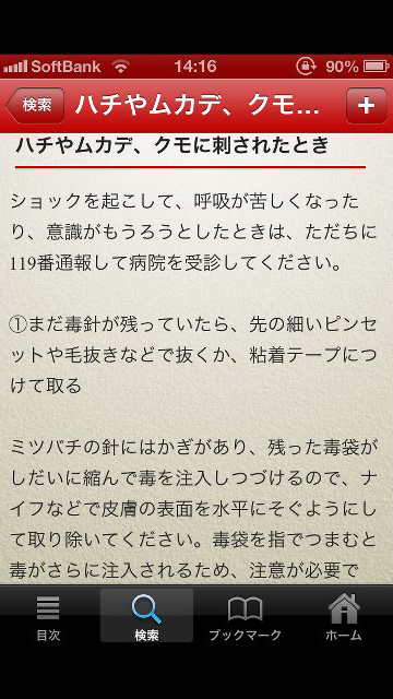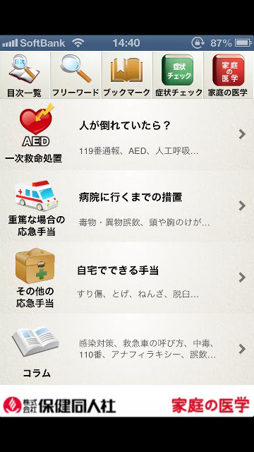 そんな時に役立つのがこちらのアプリ。怪我の状態や場合に応じた応急処置の方法を見ることができます。目次一覧から該当する怪我の状態や具合を検索したり、フリーワードから検索することも。