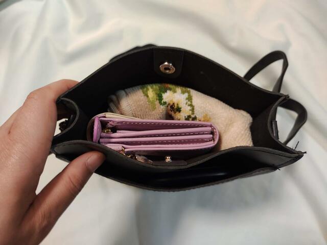 こちらのバッグはマチ、長さもあり、柔らかい素材なので長財布を入れても余裕がありました。(※見えにくいですが、フロント部分のポケットに携帯電話を入れています。)