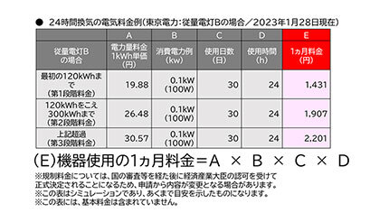 図は一例として、消費電力100Wの機種で、東京電力エナジーパートナー(東電EP)の従量電灯Bの単価(2023年1月28日現在)で試算したものである。恐らく、第2段階料金の単価26.48円のご家庭が多いと思うが、この場合、約1907円(月)の電気料金となる。