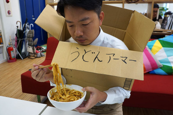 うどんアーマーは持ち運びが大変なので、カレーうどんを食べる時は、家から着て来ちゃいましょ!