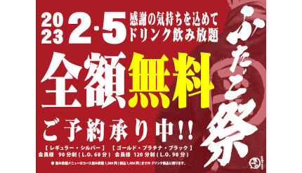 「大阪焼肉・ホルモン ふたご」では、毎年2月5日を「ふたごの日」として「ふたご祭」イベントを実施。2022年2月はコロナ禍のため開催時期を8月にずらして実施したが、今回の2月5日の開催は3年ぶりとなる。今年のふたご祭は、飲み放題が全額無料で何杯飲んでもタダになる。17時から、浜松有楽町店を除く国内店舗で実施する。