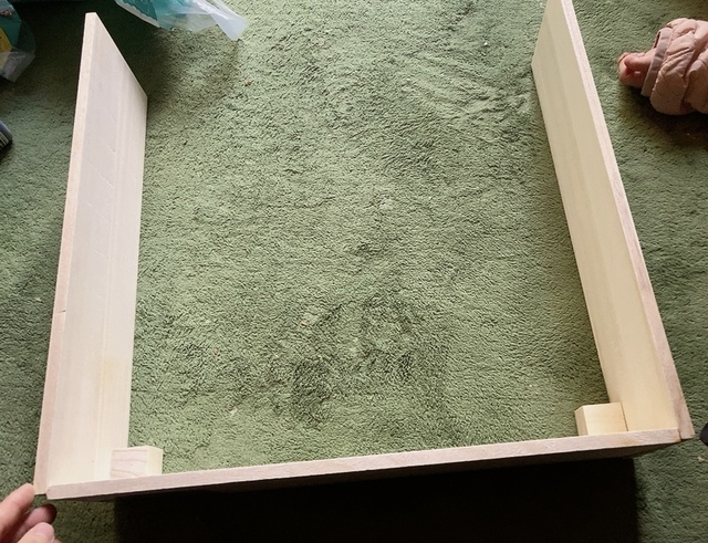 大きい板の角に2つ、角材をボンドでつけます。