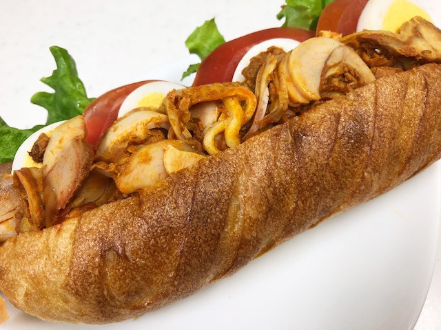 20センチ以上はあろうかと思う“ミルクパン”という軟らかいほのかに甘いパンに、具がもりもりにサンドされていて食べ応えがあります!