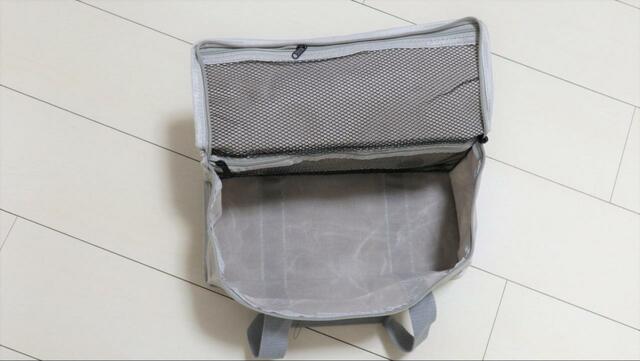 内側にメッシュポケットが2つあり、一つは蓋の裏、 もう一つは本体の奥にあります。いずれもファスナーは1本で、左側から右側に開ける設計です。