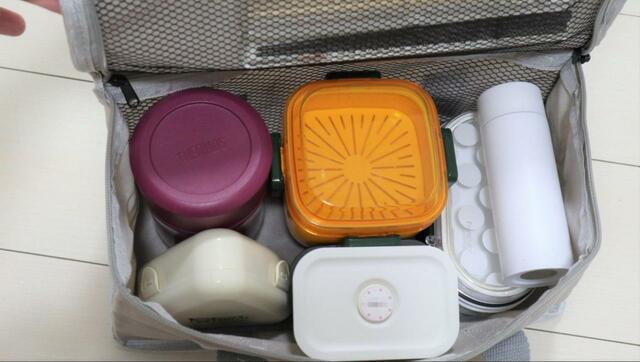 大人用のお弁当箱が2つ、スープジャー1つ、おにぎりケース1つ、フルーツケースが2つ、ミニサイズの水筒が1つ入りました。