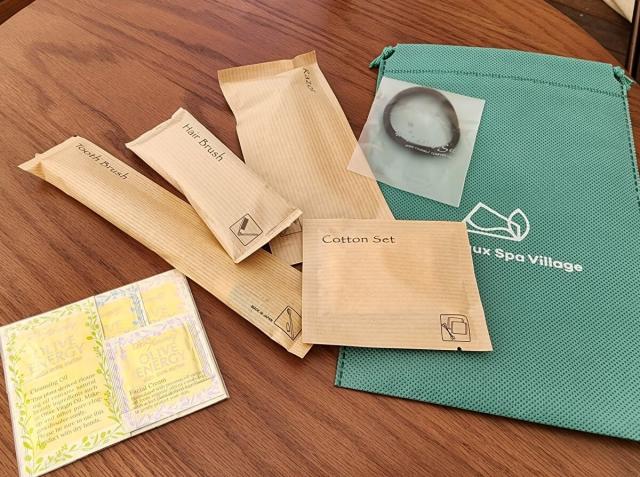 アメニティは、ヘアブラシと歯ブラシとカミソリとコットンとヘアゴム。女性には特別に洗顔料、化粧水などのセットも付いています。