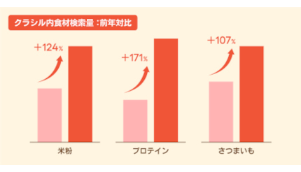 なお、同じく価格が高騰している「砂糖」の代用としては、食材そのものが甘みを持ち製菓に利用しやすい「さつまいも」の検索数が増加した。