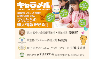 「Character Melting System:キャラメル」は、写真に写ってしまった顔出しNGの子どもや、名前などを高速自動消去できるサービス。2022年11月には特許を取得している。