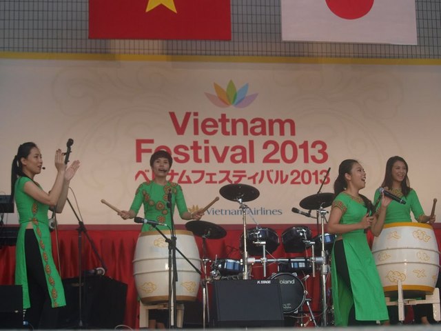 もちろん、ステージも盛りだくさん!まずホーチミン市芸術団のパフォーマンスがいろいろと素晴らしかったデス。綺麗なお姉さま方が4人集まって楽器演奏と歌をご披露。皆さんお綺麗でしたが一番右の方が女優さん?!という感じで、しかも途中で太鼓叩きだすのでスゲーカッコよかったです!
