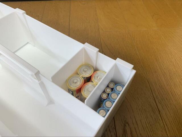 通常の収納ボックスではスペースが大きくてしまいづらい乾電池も、入れる量や電池の大きさに合わせたぴったりのサイズで収納可能。