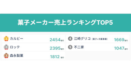 企業情報データベース「SalesNow DB」に基づく、菓子メーカー売上ランキングTOP5を発表