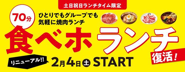 焼肉チェーン「焼肉の和民」全25店舗では2023年2月4日(土)から土日祝日ランチタイム(11:00~16:00)限定で、一人1,980円(税込2,178円)で焼肉が食べ放題になる「食べホ ランチ」プランを復活販売しています。