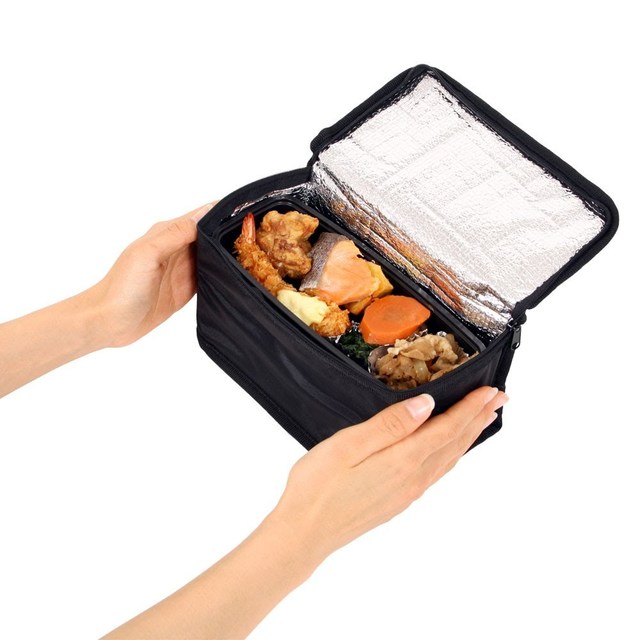 お弁当箱を丸ごと温められるポーチ。しかも、2段式スリムタイプの弁当箱に対応したものです。鞄の中にも入れやすいため、女性にはこの形のほうが人気だとか。