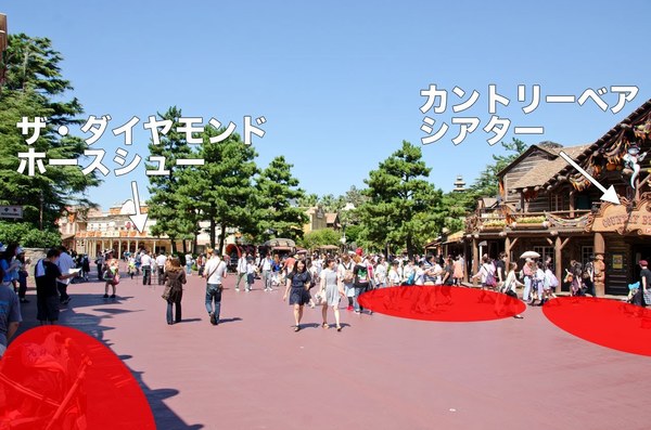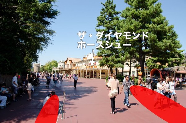 最初の停止位置は、『カントリーベア・シアター』とザ・ダイヤモンドホースシューの間です。グッズを売っているワゴンの手前付近と覚えてください。