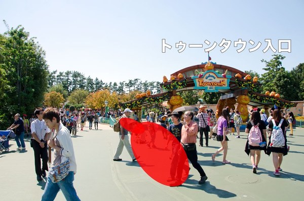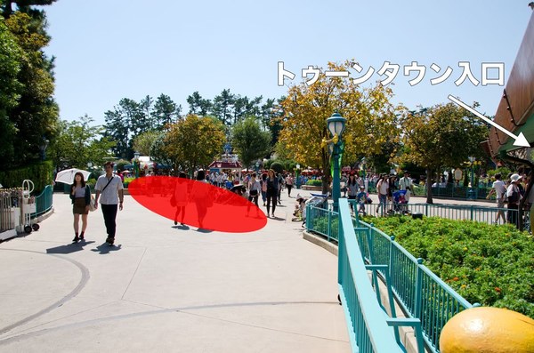 3回目の停止位置は、トゥーンタウンの入口の門をくぐってすぐ。ここは左手が壁なので、キャラ全員が右手側を向きます。3人揃って同じ方向を向いている写真を撮れる可能性があります。
