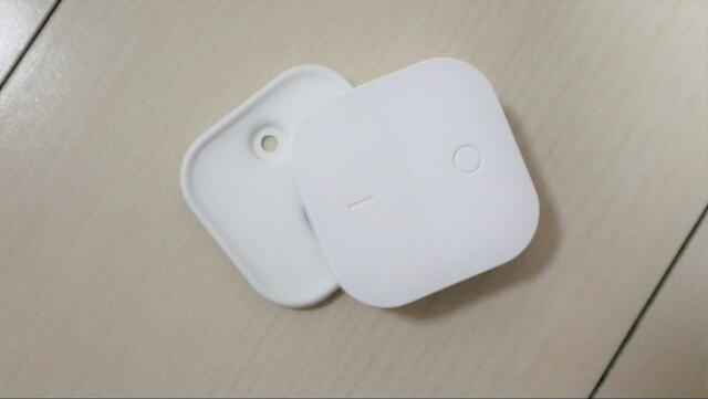 リモコンは親指と人差し指でつまめるサイズで、壁などに取り付けるための補助パーツが付いています。