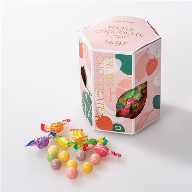ブルーベリー、ストロベリー、レモン、マンゴー、メロン、バナナの6種類の味が楽しめるフルーツチョコレート。