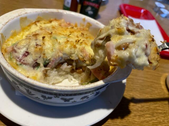 納豆、炊いたご飯、バター、醤油、かつおダシ、玉ねぎ、ピーマン、ベーコン、サラミ、チーズ、パン粉