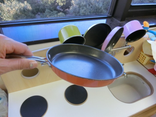 100円ショップに行くと、小さなフライパンや鍋も売っています。包丁は与えられなくても、泡立て器やお玉だったら危なくはありません。