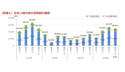 観光庁は2月15日、「旅行・観光消費動向調査」(速報ベース)を発表。2022年10~12月期の日本人の国内旅行消費額が5兆12億円(19年同期比0.6%減)となり、新型コロナ前の水準まで回復していることがわかった。前年同期比は47.5%増だった。