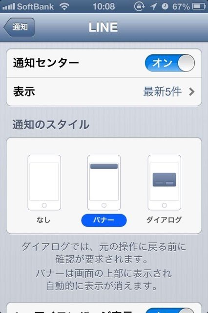 ここで「通知のスタイル」が3パターンありますが、メッセージ内容が大きく表示される「ダイアログ」を選んで。さらに「ロック中の画面に表示」もオンにしておくと、スマホをロックしているときでも、メッセージをチラッと確認できます。