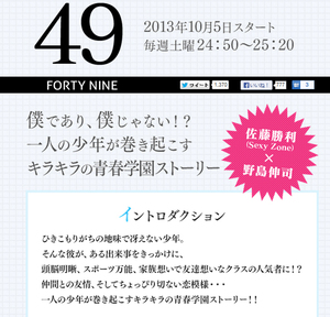 タイトルの『49』は、魂がこの世にいられる四十九日間のこと。出演は、Sexy Zoneの佐藤勝利、ジャニーズJr.の神宮寺勇太・安井謙太郎、紺野まひる、山本舞香、野村麻純など。