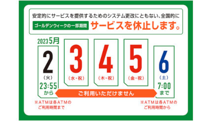 日本郵政グループのゆうちょ銀行は、5月2日23時55分~5月6日7時までの期間、ほぼすべてのサービスを休止する。ゴールデンウィーク(GW)の祝日となる5月3日、4日、5日は利用できなくなる。