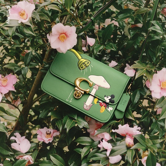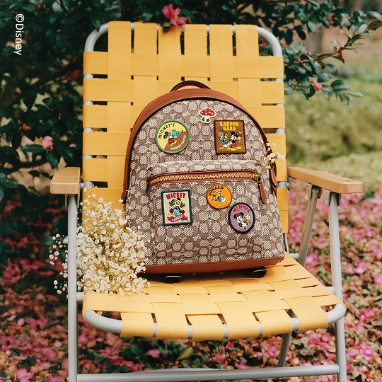 バックやトートには、コーチのシグネチャー ジャカードに、ミッキーたちのパッチをプラス。