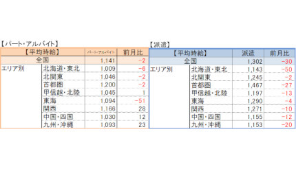 「派遣」における全国・全職種の平均時給は1302円で、前月比マイナス30円、前年同月比マイナス24円。全国・全職種平均よりも時給の低い「軽作業・物流・製造」カテゴリの個別案件が全国で掲載されたことを受けて下降したものの、その影響を除けば22年8月以降横ばいが続いているとのことだ。