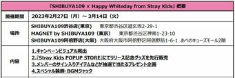 人気ボーイズグループ・Stray Kids(ストレイキッズ)とSHIBUYA109がコラボしたホワイトデーキャンペーン『SHIBUYA109 × Happy Whiteday from Stray Kids』が、2月27日(月)~3月14日(火)に「SHIBUYA109渋谷店」「MAGNET by SHIBUYA109」「SHIBUYA109阿倍野店」で開催されます。