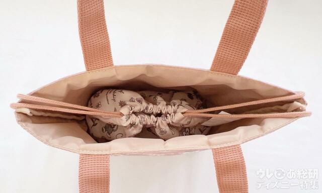 持ち手はくすみピンク、本体はモカ地に表にはメインアート。