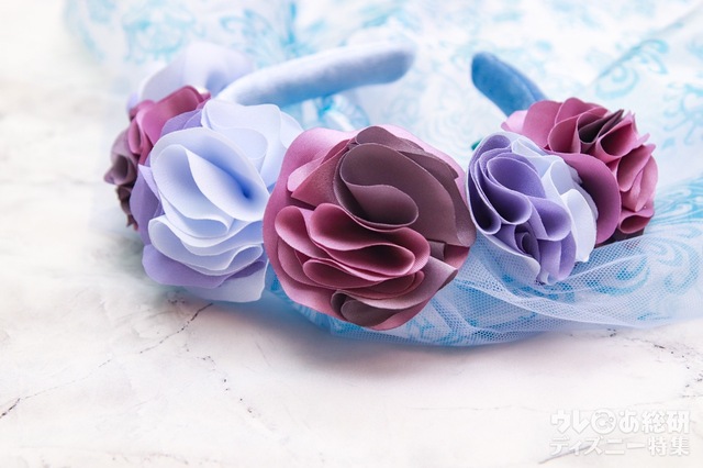 全体的に淡いブルーのカチューシャに、くすみカラーの大ぶりな薔薇があしらわれています。