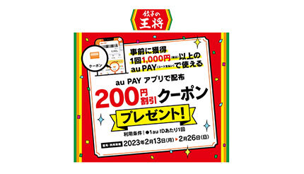 スマホ決済サービス「au PAY」アプリで配布されている「餃子の王将」で使える200円割引クーポンは、2月26日で終了する。「餃子の王将」で1000円以上の飲食をするなら、au PAYのお得なクーポンを事前に獲得し、セットしてからau PAY(コード支払い)で支払おう。