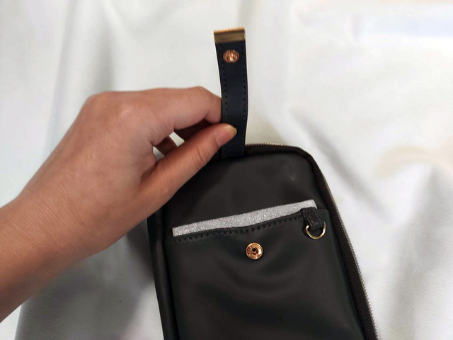 スマホショルダーの前面には「前面ポケット」があるので、ペン、携帯などを入れることができます。前面ポケットを使用する場合は、スナップボタンを取り外して、ポケットに入れたいものを収納していきます。