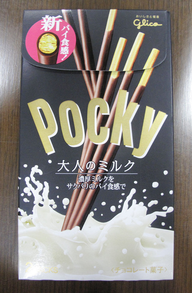 パッケージには「濃厚ミルクをサクパリのパイ食感で」と書かれています。通常のポッキーに比べると、色が薄め。やはり濃厚ミルクの影響でしょうか。