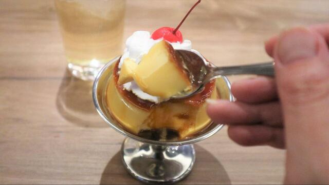スプーンで断面をカットすると、アイスのような固さを感じます。濃厚な卵とクリームの風味に、苦めのカラメルがアクセント。大人のプリンでした。